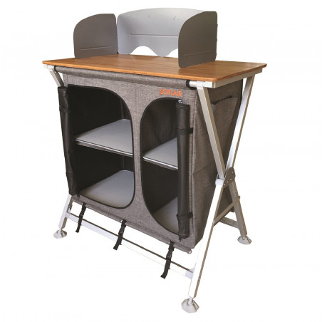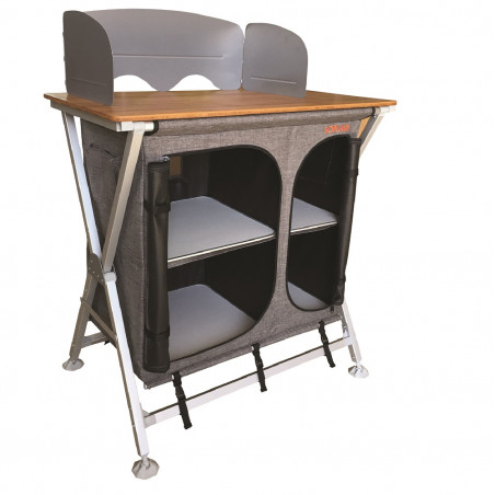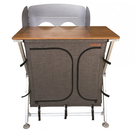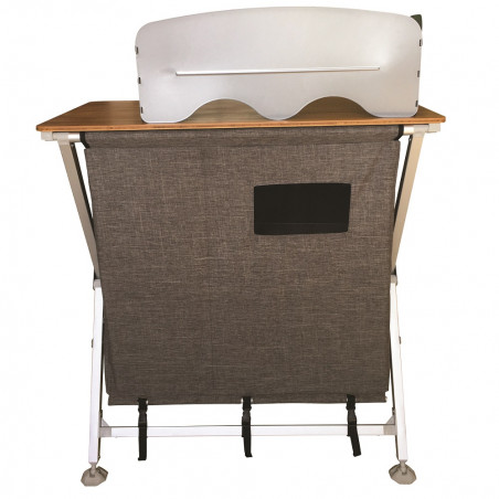 Mueble de cocina con encimera de bambú natural y estructura plegable de aluminio.Equipado con cuatro cómodos espacios de almacenamiento y un bolsillo a cada lado. dispone de un paraviento de aluminio que se coloca sobre la bandeja de bambú.su tela de poliester recubierta de PVC tiene ventilaciones para evitar olores a humedad. la base de las patas disponen de ejes giratorios que permiten ajustar los muebles a las variaciones del piso.