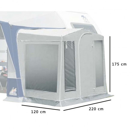 Anexo lateral avancé Ticamo Luxe, para todos los modelos fabricados después de 2011 menos el modelo Turín. Espacio adicional que se acopla en el lateral del avance. Puede ser usado como espacio cocina, de almacenamiento o habitación. Una ventana en cada lateral, y una puerta con dos ventanas en el frontal. Fabricado en PVA All Season. Medidas: 120 x 220 x 175 cm de alto.