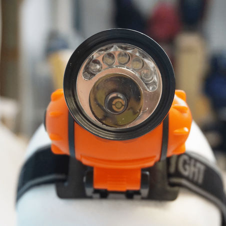 Linterna frontal 5 LEDs + una potente bombilla de 1W con gomas ajustables.