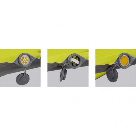 La colchoneta Oregon está equipada con una válvula flip de alta calidad con doble función: en el modo de inflado, la válvula extrae aire instantáneamente y llena la espuma para un uso rápido. En el modo de desinflado, el aire se escapa más rápido y facilita el enrollado, mientras que la válvula evita que el tapete devuelva el aire.