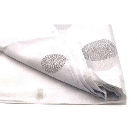Esta cortina es el complemento más decorativos para vestir su avancé o tienda cocina. El estilo número 5 de Ticamo combina un fondo blanco, muy fresco y luminoso, con adornos de círculos grises en varias tonalidades.