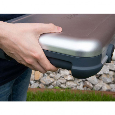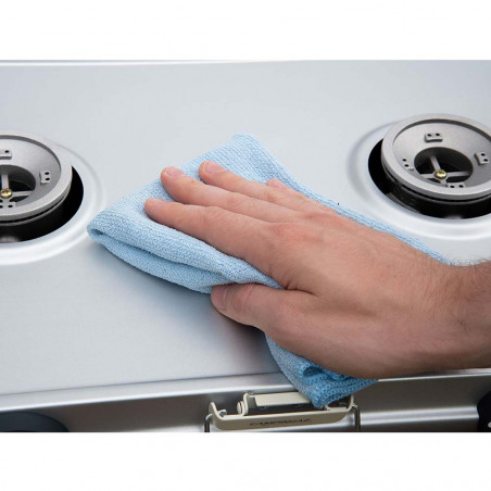 El diseño compacto, con asa de transporte incorporada, permite ahorrar espacio a la hora de guardarlo en su coche o caravana. También cuenta con soportes para cacerolas de acero esmaltado con protección contra el viento integrado. Una vez terminada la comida, los soportes pueden quitarse para una limpieza rápida y fácil.