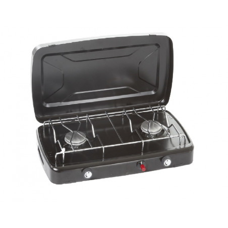 Cocina de gas de 2 fuegos, estable y compacta. Fácil de transportar. Los quemadores son regulables individualmente. La estructura es metálica esmaltada con polvo con grill de níquel cromado resistente a deformaciones.