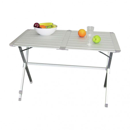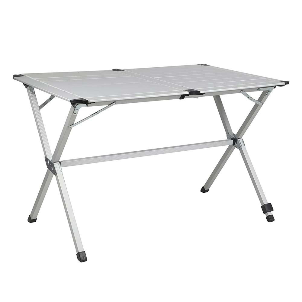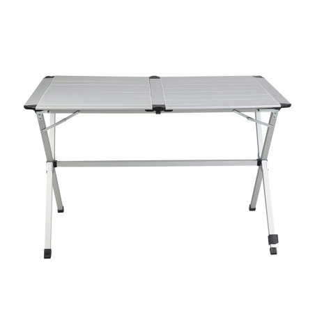 Mesa de camping de aluminio plegable y ligera con tablero de panel de listones enrollable de aluminio. Una de las patas es ajustable en altura para compensar terrenos irregulares. Configuración rápida y sencilla; tamaño de paquete pequeño. Viene con una práctica bolsa de transporte. El sistema "Gap Less" permite el mantenimiento de las láminas del tablero siempre en su sitio.