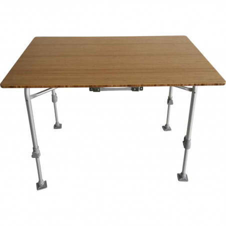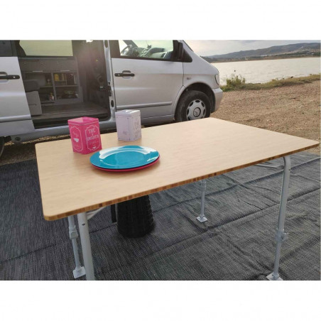 La mesa de bambú tiene 4 pies antihundimiento y es regulable en altura, lo que resulta muy práctico para adaptarse al tipo de suelo y a la inclinación del terreno donde se quiera instalar.