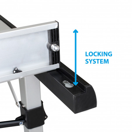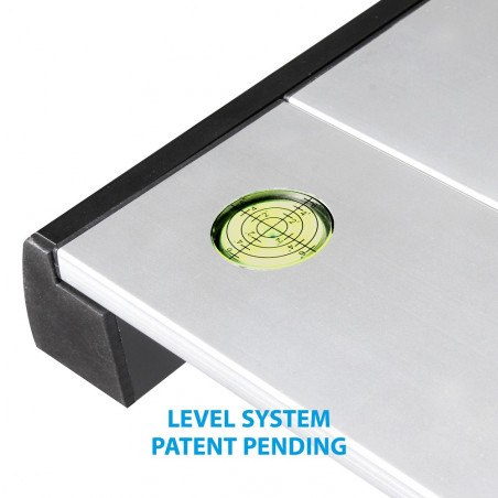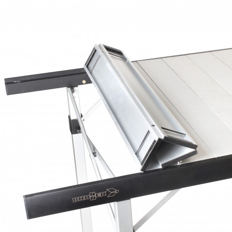 - Tablero sin ranuras que se conecta al bastidor de la mesa mediante un cierre rápido.