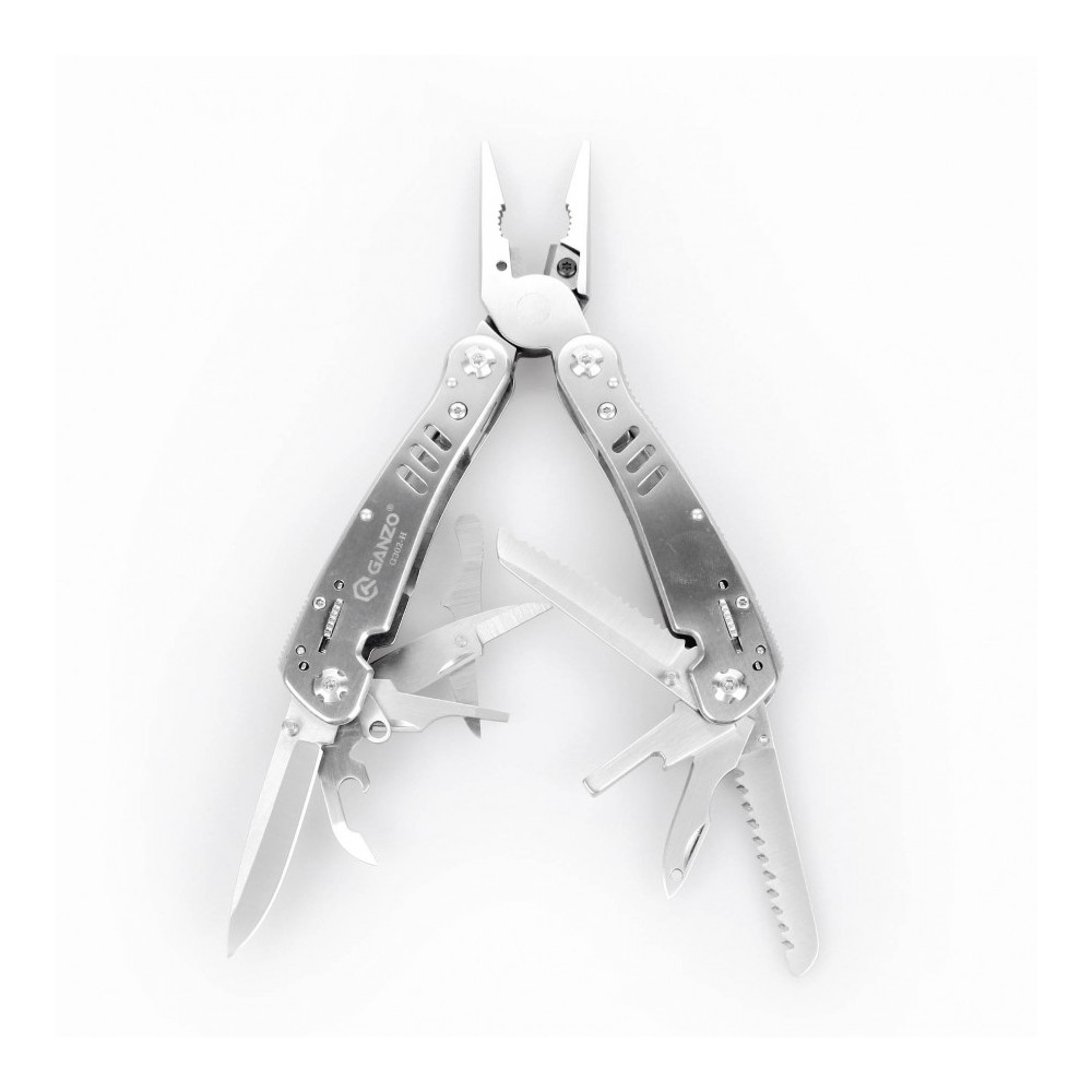 Ganzo G302-H es una multiherramienta basada en el ya conocido modelo de la marca Ganzo. Sin embargo, los cambios afectaron no solo el procesamiento del metal, sino el aspecto de algunas herramientas. Como resultado, los compradores han recibido otra muestra excelente de una herramienta práctica, el beneficio de la cual cada propietario podrá evaluar en la práctica. Todas las herramientas, así como la carcasa de la multiherramienta Ganzo G302-H, están hechas de acero 440C. Es una aleación de alta calidad que se refiere a la categoría de acero inoxidable. Se puede utilizarla en las condiciones de contacto frecuente con el agua, que son típicas para marchas turísticas, pesca y caza. El cuidado mínimo del instrumento garantizará su durabilidad y seguridad de las cualidades externas. La herramienta principal de multiherramienta según su localización son alicates. También tienen la función de pinzas cortantes y la capacidad de agarrar firmemente tuercas, clavijas y otros objetos de sección redonda. El resto de las herramientas están distribuidas entre los dos mangos de la multiherramienta y colocadas dentro de ellas. Son dos cuchillos (ordinario y serrado), una sierra, un abrelatas y un abrebotellas, tijeras, una lezna, un destornillador pequeño con una ranura recta, un soporte magnético para palas intercambiables, una herramienta para quitar aislamiento de cables. Junto con la multiherramienta también se vende un conjunto de destornilladores necesarios para trabajar con varios husillos y tornillos. Están colocados en un organizador común. Este organizador, junto con la multiherramienta, puede ser almacenado en la caja envolvente de nylon.
