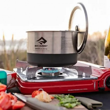 Cazuela con tapa de la marca Sea to Summit. Se puede colocar directamente sobre las ascuas. Material: Acero inoxidable Capacidad: Cazuela de 3.7 litros. Medidas cazuela: 135 x 203 mm. de diam. Peso: 481 g.