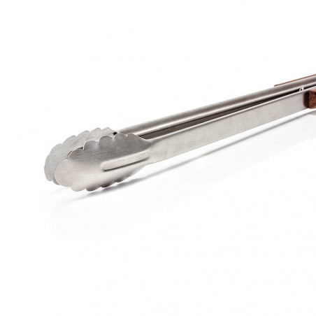 Las pinzas para barbacoa y carbón hechas de acero inoxidable cepillado se adaptan bien a la mano gracias a su fino mango de madera. Gracias al cabezal de pinza curvo, puedes agarrar y colocar fácilmente alimentos, carbón y briquetas como desees. El práctico mecanismo de bloqueo le permite ahorrar espacio al guardar sus pinzas. Gracias al ojal adicional, también puede colgarlos en el armario o en un gancho.