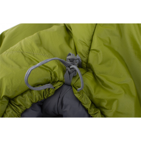 La combinación de estas propiedades garantiza la comodidad del usuario y un clima interno favorable del saco de dormir. El tratamiento repelente al agua proporciona una protección suficiente contra las inclemencias del tiempo. Tejido con Clima Control Shield es ligero, plegable y suave al tacto.