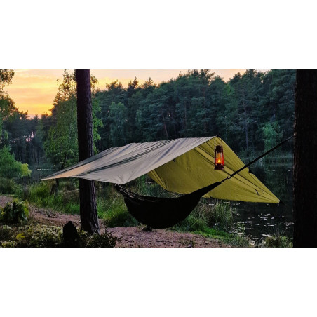 Con las dimensiones perfectas para nuestras hamacas de tamaño normal, el Tarp 3x3 es lo que recomendamos como una amplia cubierta para una sola persona y su material. Colócala en A-frame o en forma de diamante sobre tu hamaca para una protección completa, o simplemente úsala para extender un porche en su tienda. Cocina debajo de ella. Úsala como una sábana para el suelo. Conviértelo en un refugio o tienda de campaña.