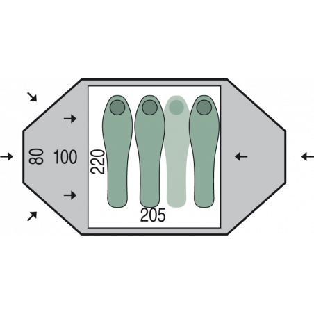 • Dispone de dos amplios avances para guardar las mochilas, las botas, etc, consiguiendo mayor habitabilidad en el interior de la tienda.