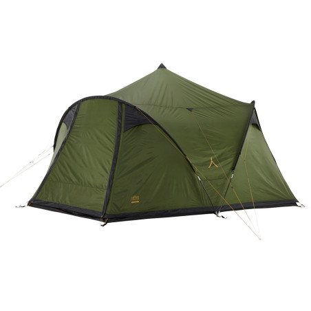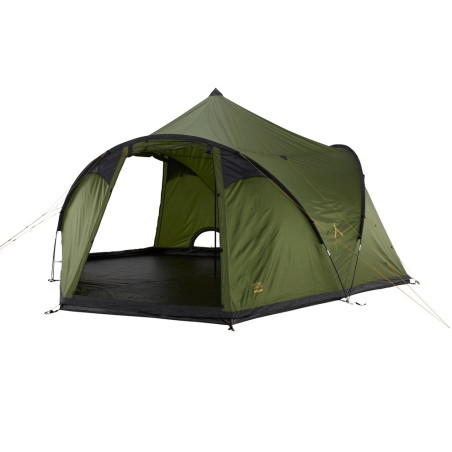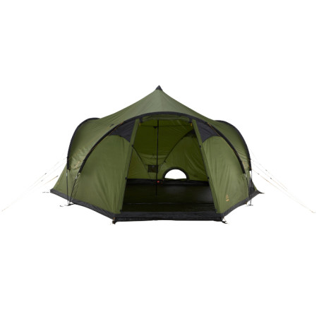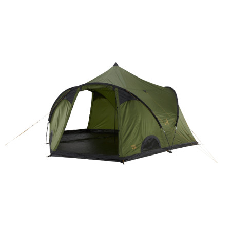 Con BLACK KNOB 10, GRAND CANYON da un nuevo enfoque a las tiendas de grupo tipo tipi. El mástil vertical central del tipi está acompañado por tres arcos de mástil idénticos que forman tres entradas idénticas y proporcionan altura de pie en toda la zona principal de la tienda. Las grandes entradas ofrecen una gran versatilidad y pueden abrirse simultáneamente para convertir la tienda en un refugio abierto al sol durante todo el día. La tienda ofrece espacio suficiente para hasta 10 personas. Las inserciones de mosquitera dejan entrar el aire y la luz por todos los rincones, lo que aumenta la sensación de amplitud dentro de la tienda. BLACK KNOB 10 es la acampada en grupo a un nuevo nivel.