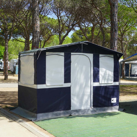 Tienda cocina de gran calidad de fabricación nacional. Amplia y luminosa, con numerosas ventanas con cortinas e incluso una mosquitera. Estructura robusta y fácil de montar y fabricada en PVC Trevira™, un plástico muy resistente, fácil de limpiar y con tratamiento impermeabilizante. Ideal para ir de camping en familia!