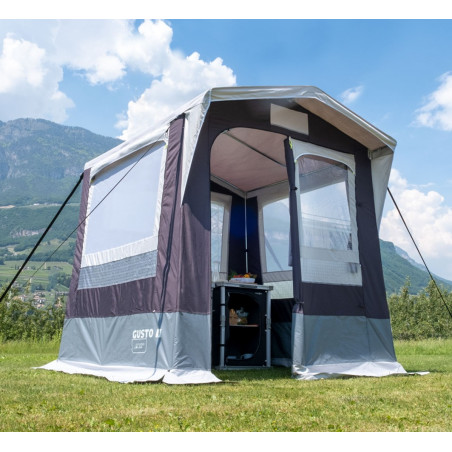 La tienda cocina Gusto NG de Brunner es una tienda cocina sencilla de Poliéster y PVC, ideal para estancia corta de verano. Es una tienda muy ligera y de montaje rápido, fabricada en una mezcla de Poliéster, PVC y Nylon Oxford, con puerta ancha enrollable lateralmente y 3 grandes ventanas con mosquitera y tapas translúcidas.