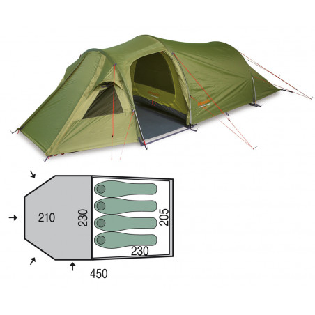 Una tienda de campaña tipo túnel muy espaciosa, apta incluso para las peores condiciones climáticas, gracias a su perfil bajo. La construcción del túnel garantiza un muy buen aprovechamiento del espacio interior.